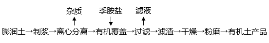 膨潤土粉→分散制漿→純化→改性或改性→純化→有機(jī)覆蓋物→過濾→干燥→粉碎→產(chǎn)品